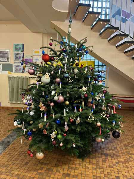 Mit Beginn der Weihnachtszeit schmückten wir, die Klasse 5c, gemeinsam mit Frau Neumann, unserer Kunstlehrerin, den Weihnachtsbaum im Foyer des SOPHIEs. Bevor es losging, hatten wir die Regeln für ein ordentliches, aber buntes gemeinsames Schmücken im Klassenraum besprochen. Anschließend gingen wir ins Foyer und schmückten dort den Weihnachtsbaum - das bedeutete, das Erlebnis fing an. Natürlich holten sich die meisten die riesigen Kugeln aus der großen kunterbunten Weihnachtskugelbox, die uns unser Hausmeister Herr Wendt zur Verfügung gestellt hatte. Aber auch die kleinen Kugeln und die anderen Weihnachtsbaumanhänger - kleine und große Figuren - schmücken heute unseren SOPHIE-Weihnachtsbaum im Foyer. Auch Licht durfte nicht fehlen, deshalb verteilten wir Lichter überall am Baum. Unsere gemeinsame Weihnachtsbaum-Schmückaktion hat uns allen sehr viel Spaß gemacht und wir sind stolz, dass wir als 5c mitwirken durften, um unser SOPHIE-Foyer bunter und heller, weihnachtlich und gemütlich gestalten zu können. Unser gemeinsames Klassenerlebnis endete mit dem Klingeln.